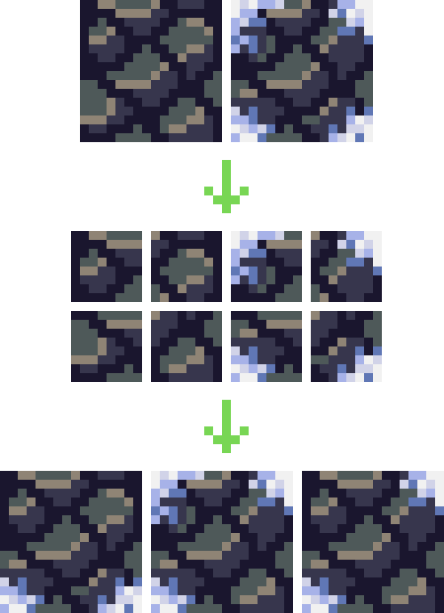 This intuition is the origin of a new method to design a tileset: create only the necessary sub-tiles and compose bigger tiles from unique building blocks.