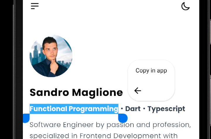 Now every time a user selects any text from any other app in her device a new "Copy in app" action allows to forward the selected text to our Flutter app.