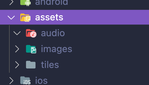 flame: ^1.12.0Create a new assets folder in the root of the project for images, audio, fonts, and any other asset used in your project:
