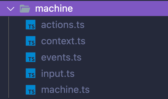 context.ts: context type and initial valueinput.ts: input type and function to initialize the context from the inputevents.ts: export union of all event typesactions.ts: functions to execute for each actionmachine.ts: final machine (setupandcreateMachine)