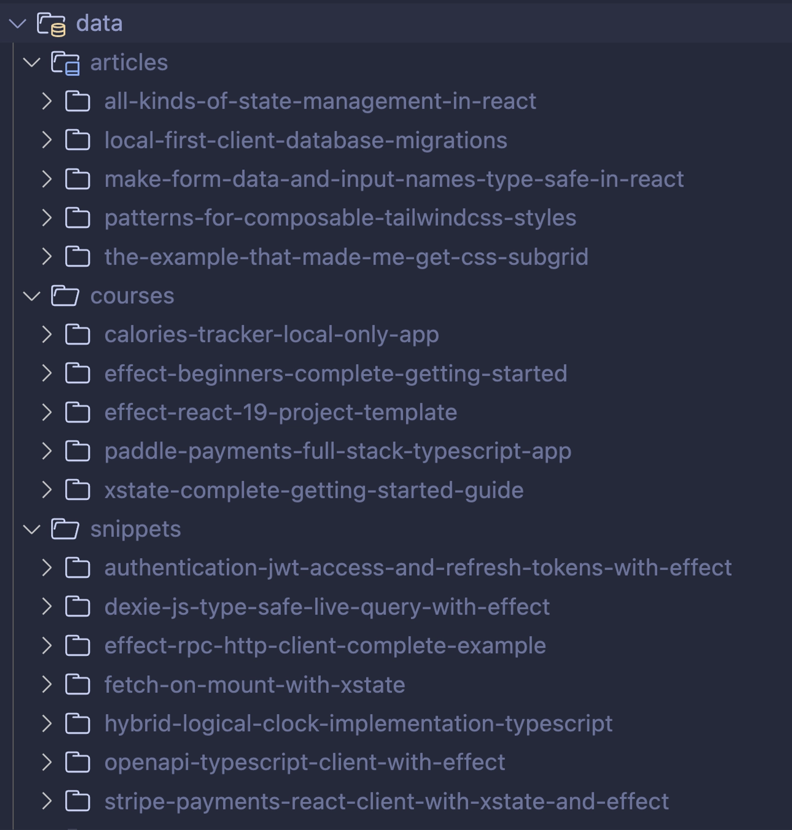 Example: typeonce.dev contains all the content as a mix of mdx and json.