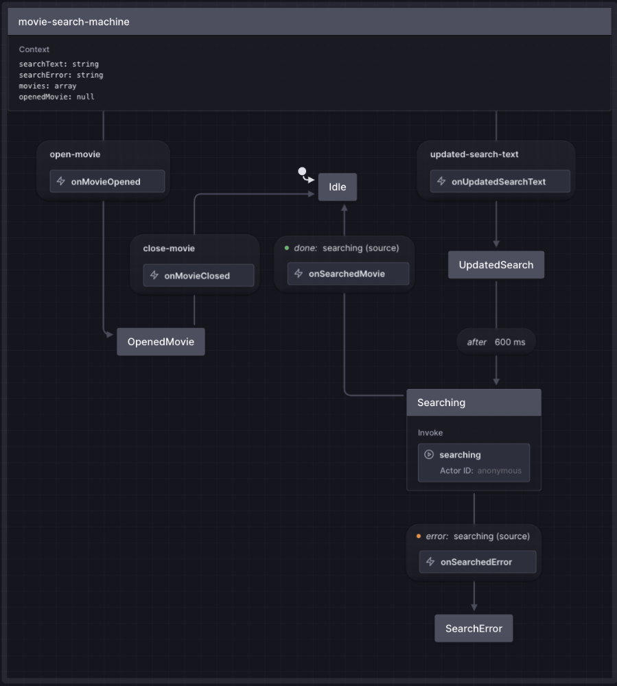 Idle: showing search results (initially empty)UpdatedSearch: search query updated, but request not yet committed- ๐๐ Debounce time from
