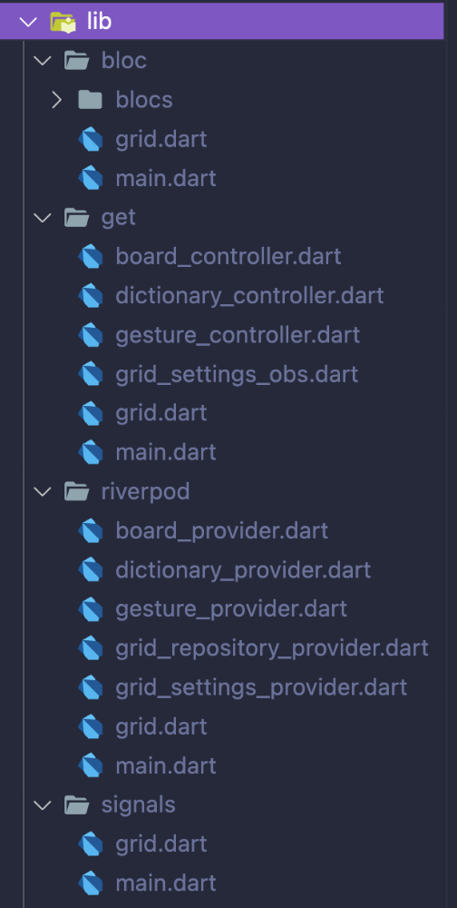 The project is a normal Flutter app. I created a separate folder and main.dart for each state management package: