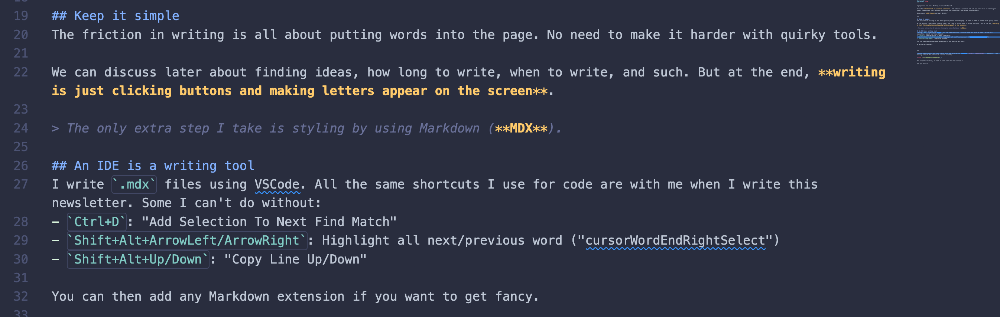 I write .mdx files using VSCode. All the same shortcuts I use for code are with me when I write this newsletter.
